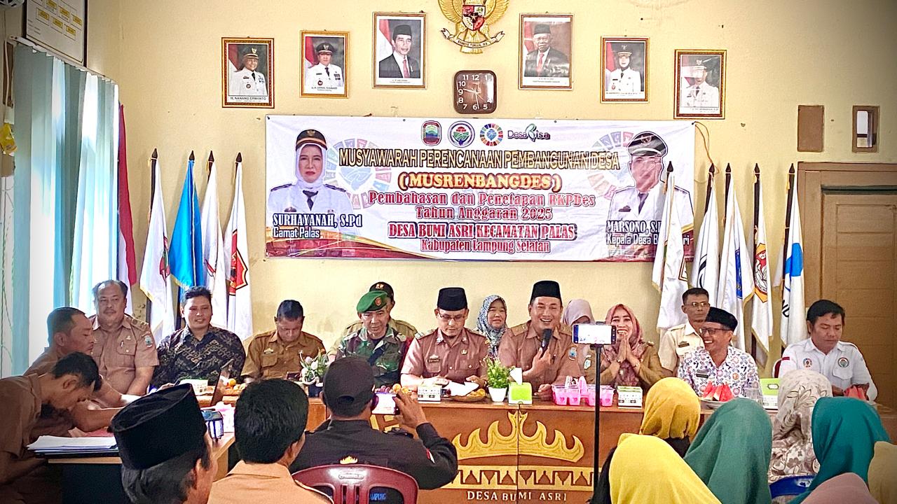 Musrenbangdes yang digelar Kantor Desa Bumi Asri dihadiri oleh Sekcam Palas, Suyadi, SE. Kades Bumi Asri, Marsono, S.Pd. Kasi Ekobang, Muslim Idrus. KUPT Puskeswan, Wartono, S.H. Plt. KUPT Puskesmas Rawat Inap Bumi Daya, Rosnani, Amd. Kep, KUPT Dalduk & KB Kecamatan Palas, Sukaryadi, SE.