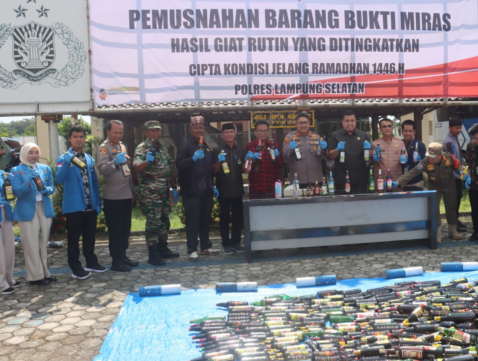 Royalnews17.com – Kepolisian Resor (Polres) Lampung Selatan menggelar pemusnahan ratusan botol minuman keras (miras) sebagai langkah konkret dalam menjaga ketertiban menjelang bulan suci Ramadan 1446 H.