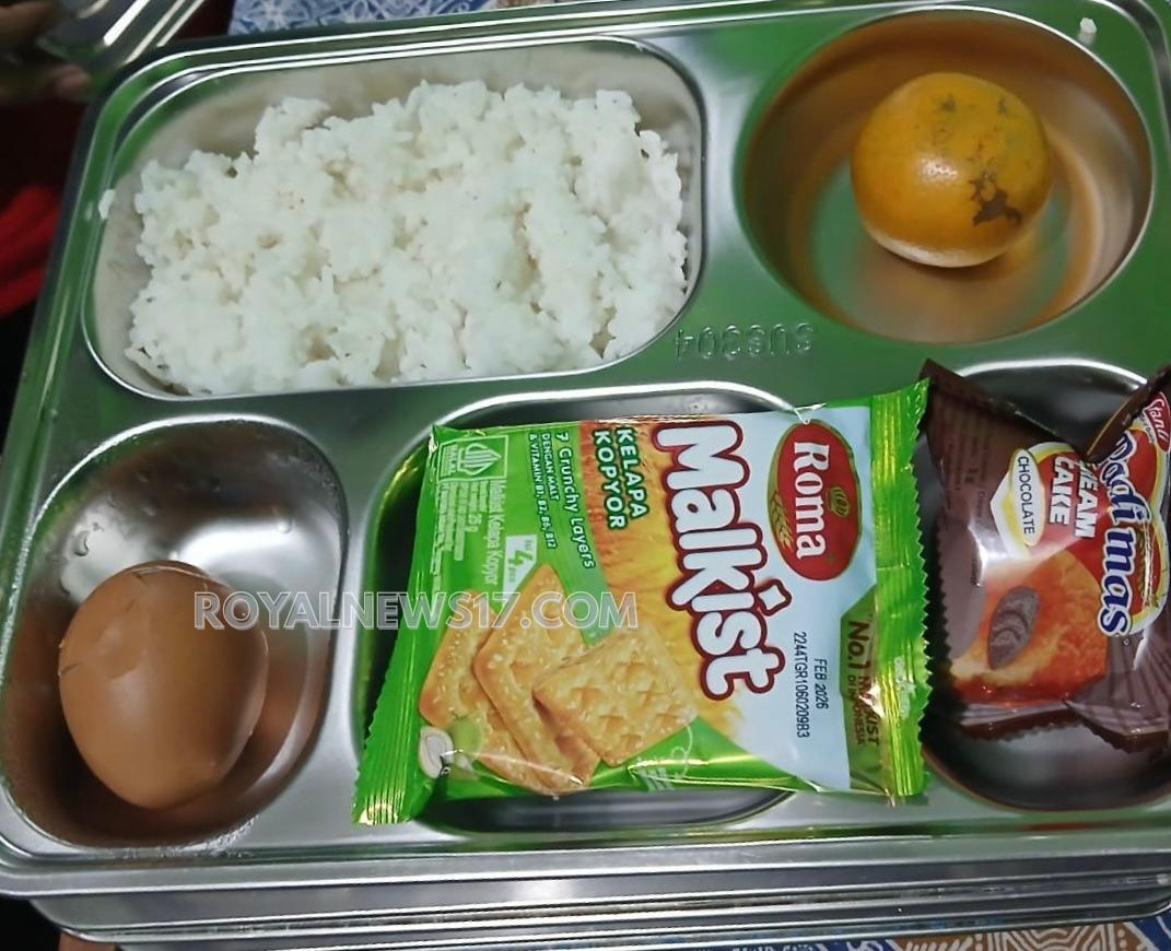Sebagian siswa menerima menu utama yang terdiri dari nasi, ayam, sayur, dan buah jeruk. Sementara itu, siswa lainnya hanya mendapatkan nasi, telur rebus, buah jeruk, serta dua bungkus makanan ringan kemasan, yakni biskuit Malkist dan kue Padi Mas.