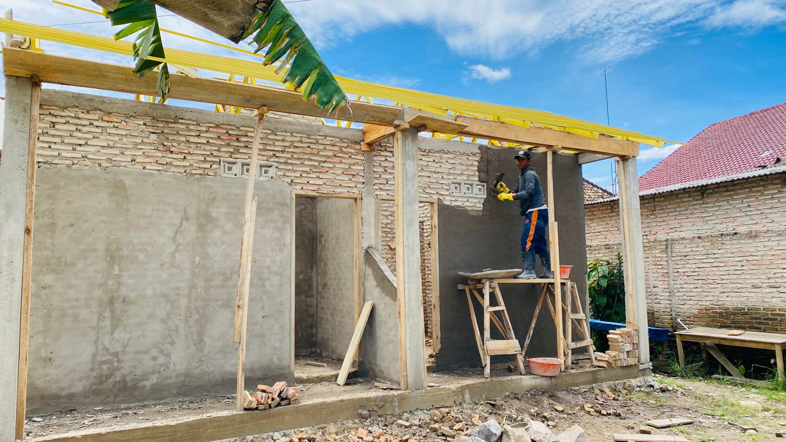 “Karena kepala tukang bukan saya melainkan Pak Kotib, dia orang Sukaraja, Pak. Kami kerja diawal 9 orang selama 15 hari waktu minggu kemarin, dengan 4 tukang lalu kulinya 5 orang. Untuk besaran gaji tukang Rp150.000, sedang gaji kuli Rp100.000,” beber Sutono.