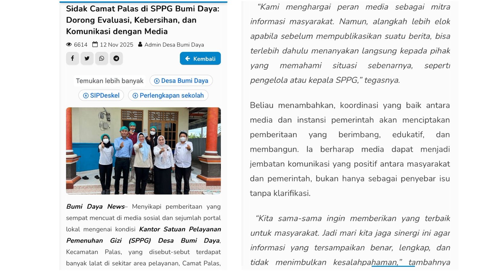 Sebelumnya, Camat Palas Ns. Rosalina, M.Kep, bersama Plt. Kepala Puskesmas Rawat Inap Bumidaya, Rosnani, S.Keb, telah melakukan inspeksi mendadak (sidak) ke kantor SPPG Bumi Daya pada Rabu (12/11/2025) menindaklanjuti pemberitaan tersebut.