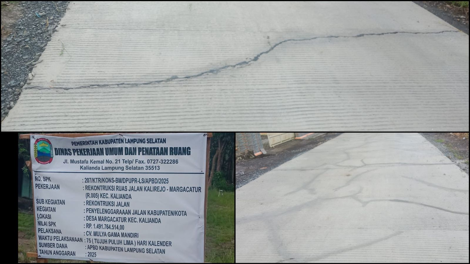 Jalan yang menghubungkan Desa Kalirejo Kecamatan Palas, Margacatur Kecamatan Kalianda, hingga Sidomakmur Kecamatan Way Panji itu dinilai mengabaikan kualitas. Padahal, pembangunan infrastruktur saat ini menjadi perhatian serius Bupati Lampung Selatan Radityo Egi Pratama, yang menekankan pentingnya kualitas agar konstruksi dapat bertahan hingga lima tahun ke depan.