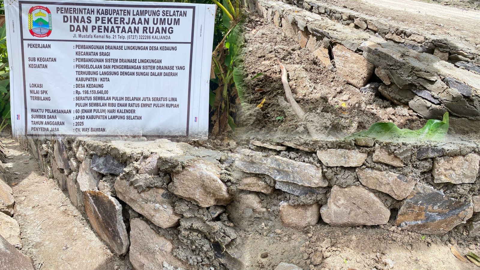 Royalnews17.com – Proyek pembangunan Sistem Drainase Lingkungan di Dusun Kedaung Lama, Desa Kedaung, Kecamatan Sragi, Kabupaten Lampung Selatan, menuai kritik tajam dari warga. Pekerjaan yang bersumber dari APBD Kabupaten Lampung Selatan Tahun 2025 senilai Rp198.159.640,00 itu diduga dikerjakan tanpa mengedepankan standar teknis konstruksi.